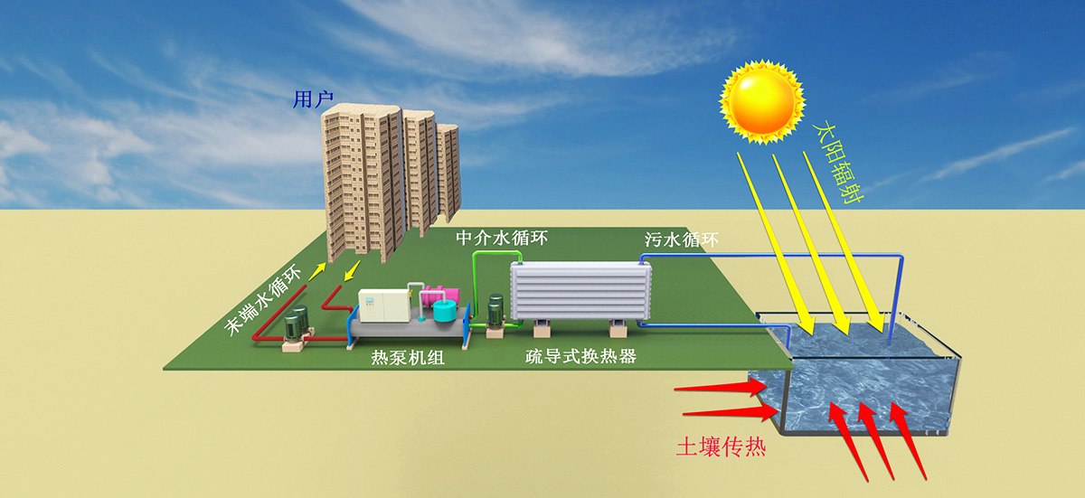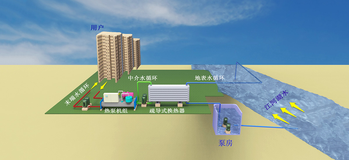 系統(tǒng)的主要設(shè)備包括地表水泵、疏導(dǎo)式換熱器、中介水循環(huán)泵、熱泵機(jī)組、末端循環(huán)泵。