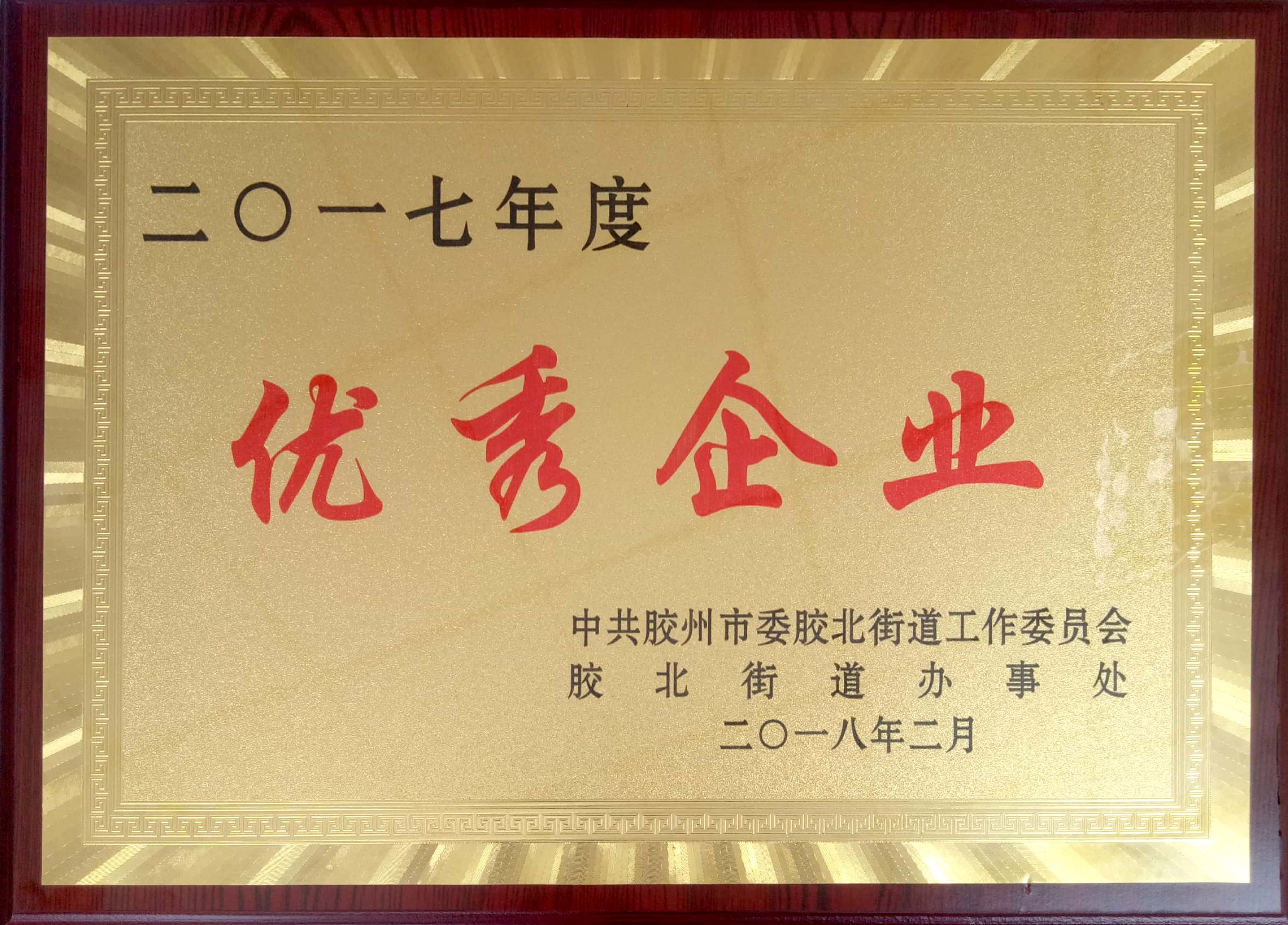 2018年2月28日上午,膠北街道黨工委、膠北街道辦事處舉行了關(guān)于2017年度先進集體的表彰大會。在對2017年度各項工作任務(wù)考核中,我司被授予“2017年度優(yōu)秀企業(yè)”稱號。